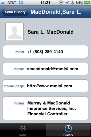 if you want to add me {Sara L MacDonald} as a contact, you can. at the bottom of the screen there is a {create new contact} spot. {not shown on the picture above}. if you don't want to add me {Sara L MacDonald} as a contact, the business card information will be saved in the "scan history".